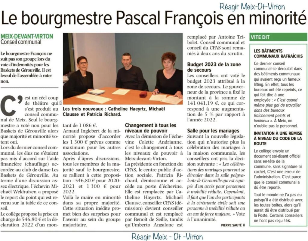Enfin petit retour à la table du conseil de la saga des subsides aux Baskets de Gérouville. Le ministre des pouvoirs locaux à répondu aux questions qui lui ont été posées en décembre 2022. Il confirme que le refus d’accorder un subside chauffage à une association relève de l’autonomie communale. Le ministre précise que le bourgmestre à le droit de participer aux votes de subsides à l’association dont il est administrateur. Il n’y a pas de conflit d’intérêt parce que cela n’affecte pas son patrimoine privé ! Dont acte.